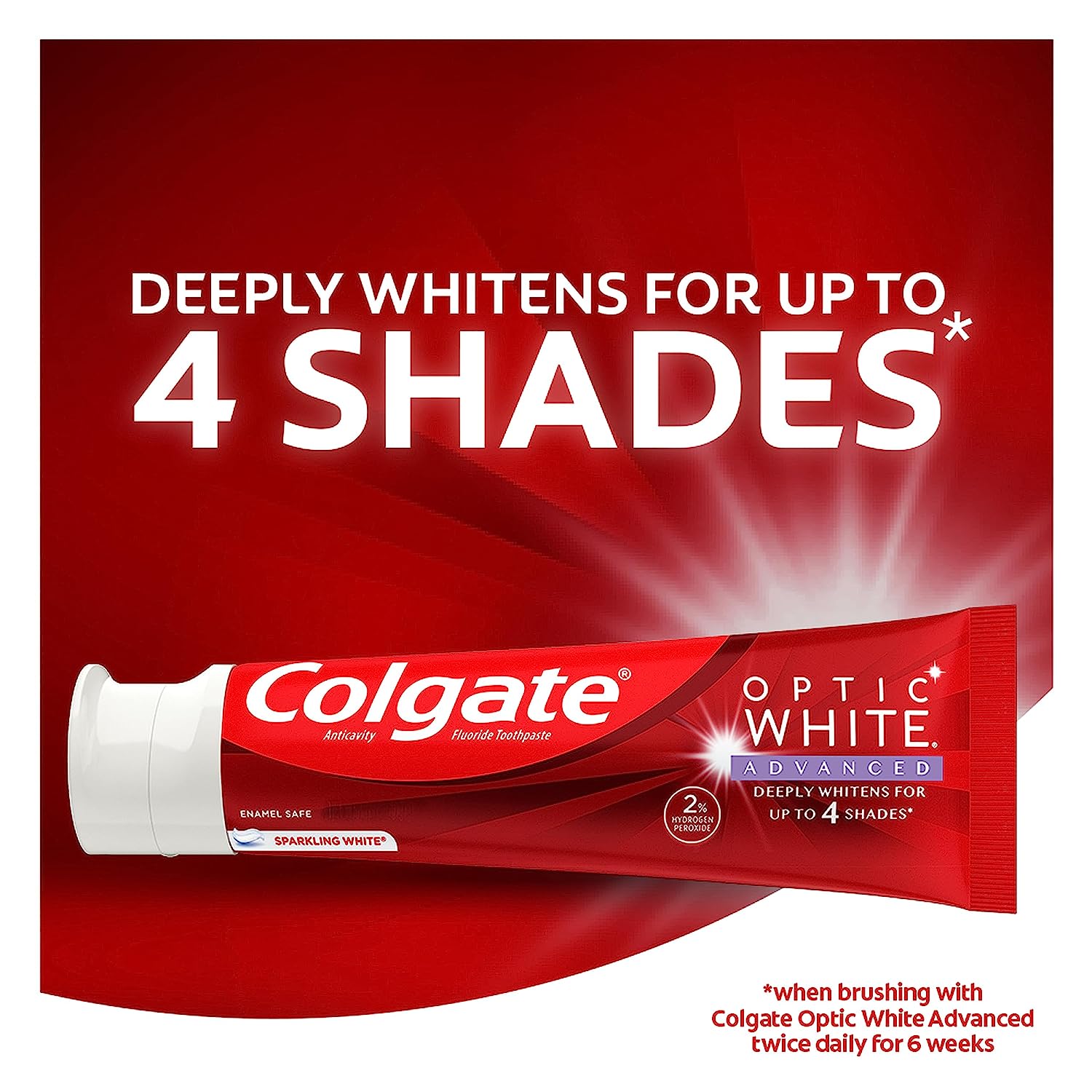 - Optic White Advanced deeply whitens up to four shades* and helps whiten teeth both inside and out (*when brushing twice daily for 6 weeks)